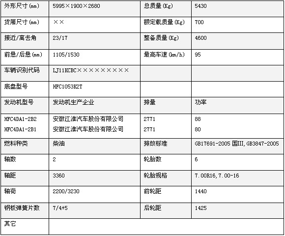 江淮掃路車  底盤型號(hào):HFC1053K2T 額定質(zhì)量:700